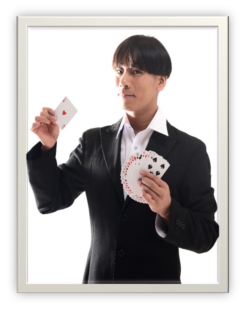 軽快なトークと音楽でお客様に楽しんでいただくスタンダードなマジシャンスタイル。トランプやコインを使い、目の前30センチの距離で体験できるクロースアップマジックから大きく見えるステージマジックまで幅広く対応しお客様を楽しませる。