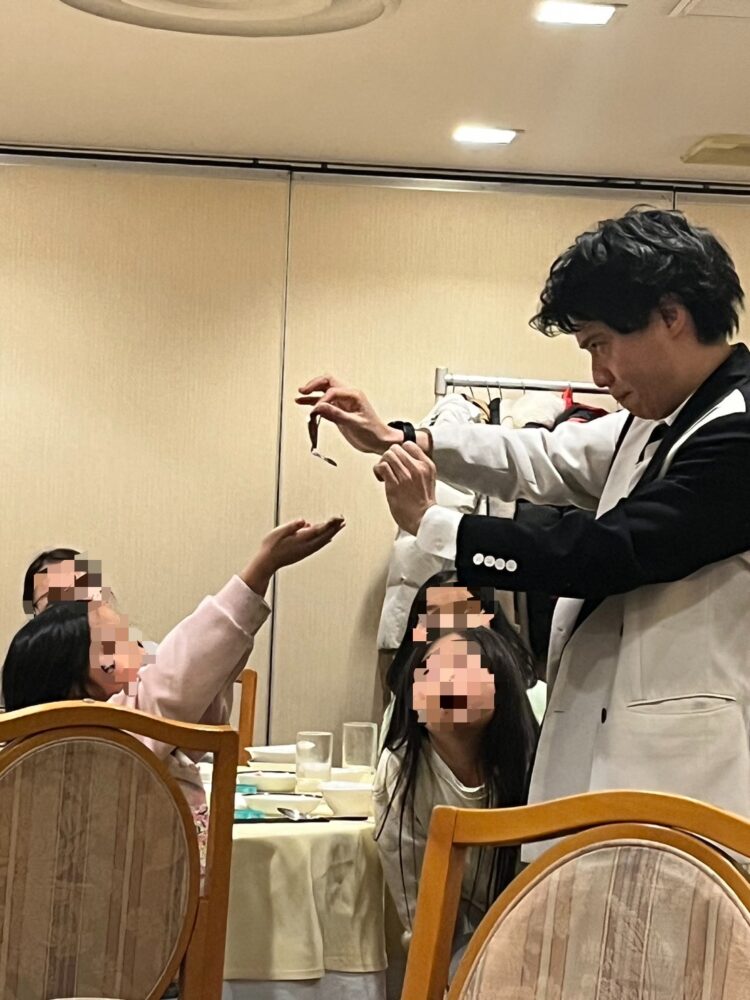 完全新作のマジックやスプーン曲げがとくにうけて、特に子供たちが目の前で曲がっていくスプーンに目をまるくして「えええーー」といっているのがかわいかったです。