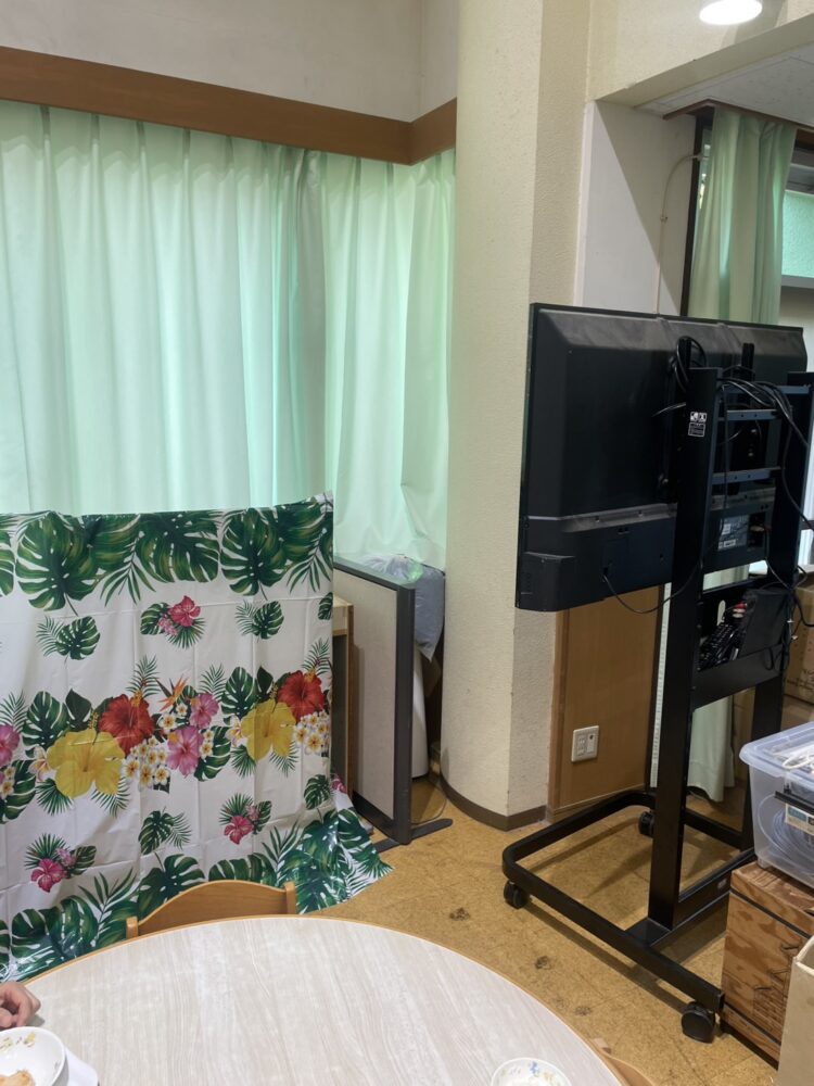 今回の会場は保育園の広いスペースで2部制で各回60人ほどの園児が参加しました。元気いっぱいすぎて途中収集がつかなくなりそうだったので、座らせて安全第一でやりました。大きなシャボン玉ができるたびにミニオンズのように「わーー!」と大盛り上がりでした、写真をとるのを忘れてしまいショー後にとったのですが、お昼ごはんがはじまっており、園児を映らないようにとったところよくわからない写真になってしまいました。。。すみません。