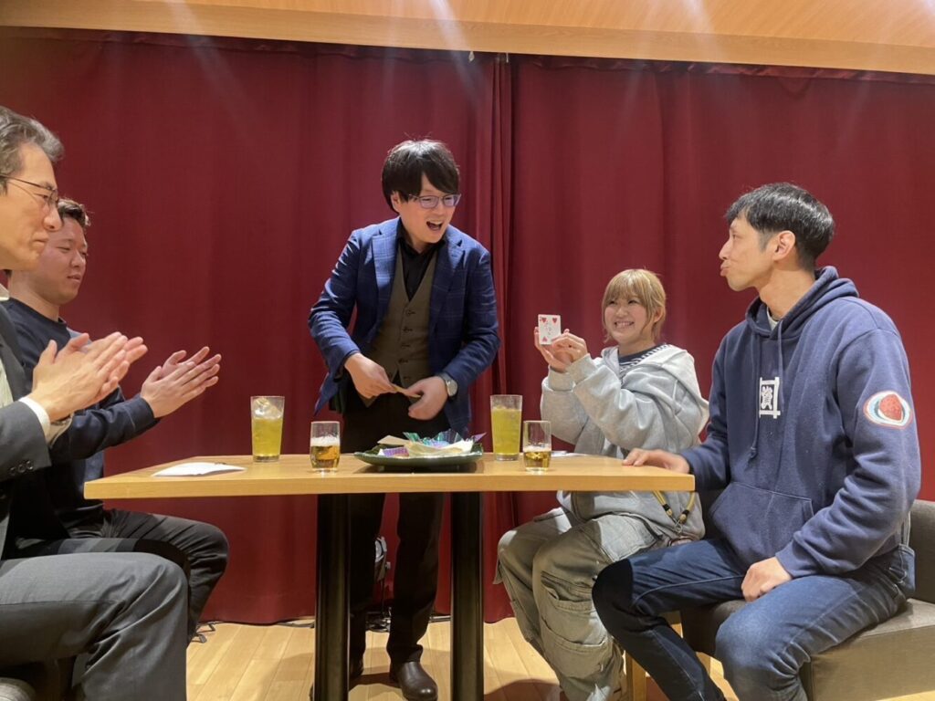 毎年恒例の研修&忘年会が開かれ、まずは代表の翔が「チップ制のマジックでお客様の満足度をあげるには」をテーマに実演&講習。参加者からは「毎回500円どころかもっとあがる」「すっと胸にはいってくる」と大好評でした。またステージ部門では昨年のMVP大吉、ナナ、おはぎがテーブルマジックを、翔太がステージリング、SEID(せいど)が変面を披露し喝采をあびていました。ただやるだけではなく、見たマジシャン全員から紙に書いてもらって、フィードバックをもらうことができ芸を錬磨していきます。こうして1人1人顔あわせることで横の情報交換や組織としてのルール、規律の共有はかっており、そのため弊社所属のマジシャンはどこに出しても恥ずかしくない人材になっております。