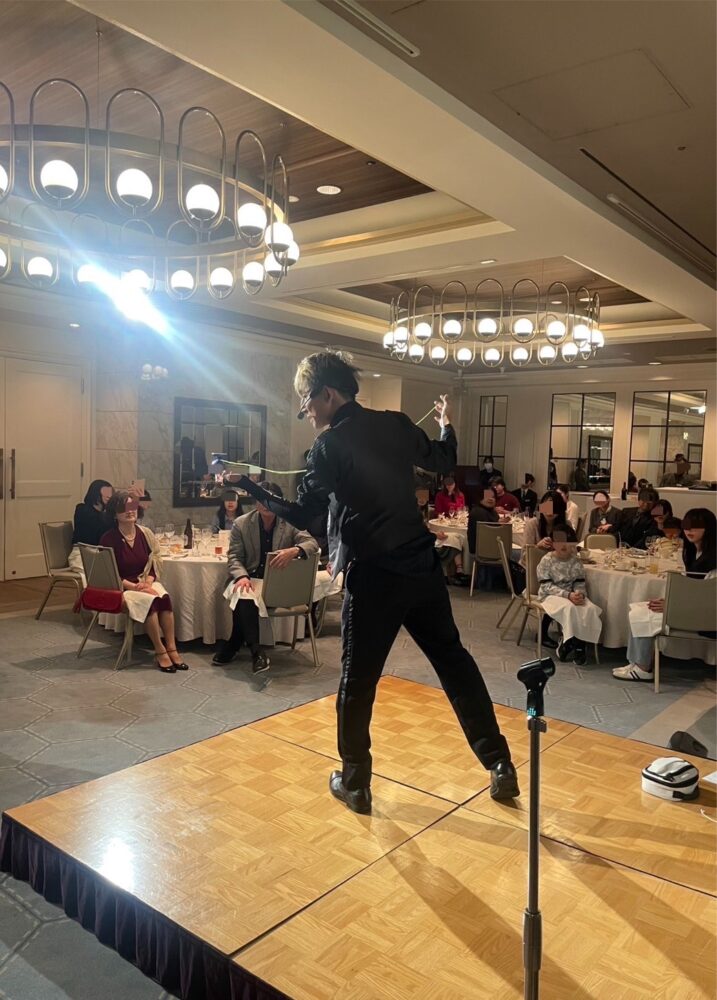 今年はトップバッターが私だったため、落ち着いたトーンのマジックを披露しました。偽物の卵が目の前で本物になるマジックでは上品な歓声をいただきました。